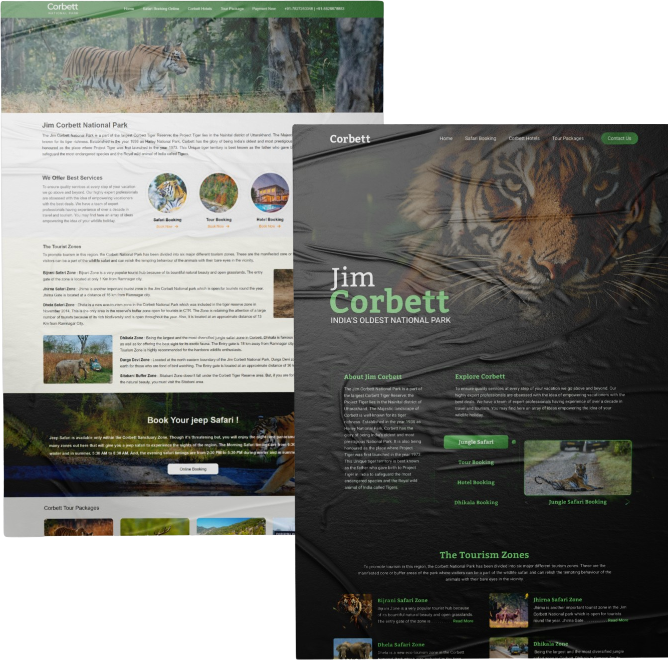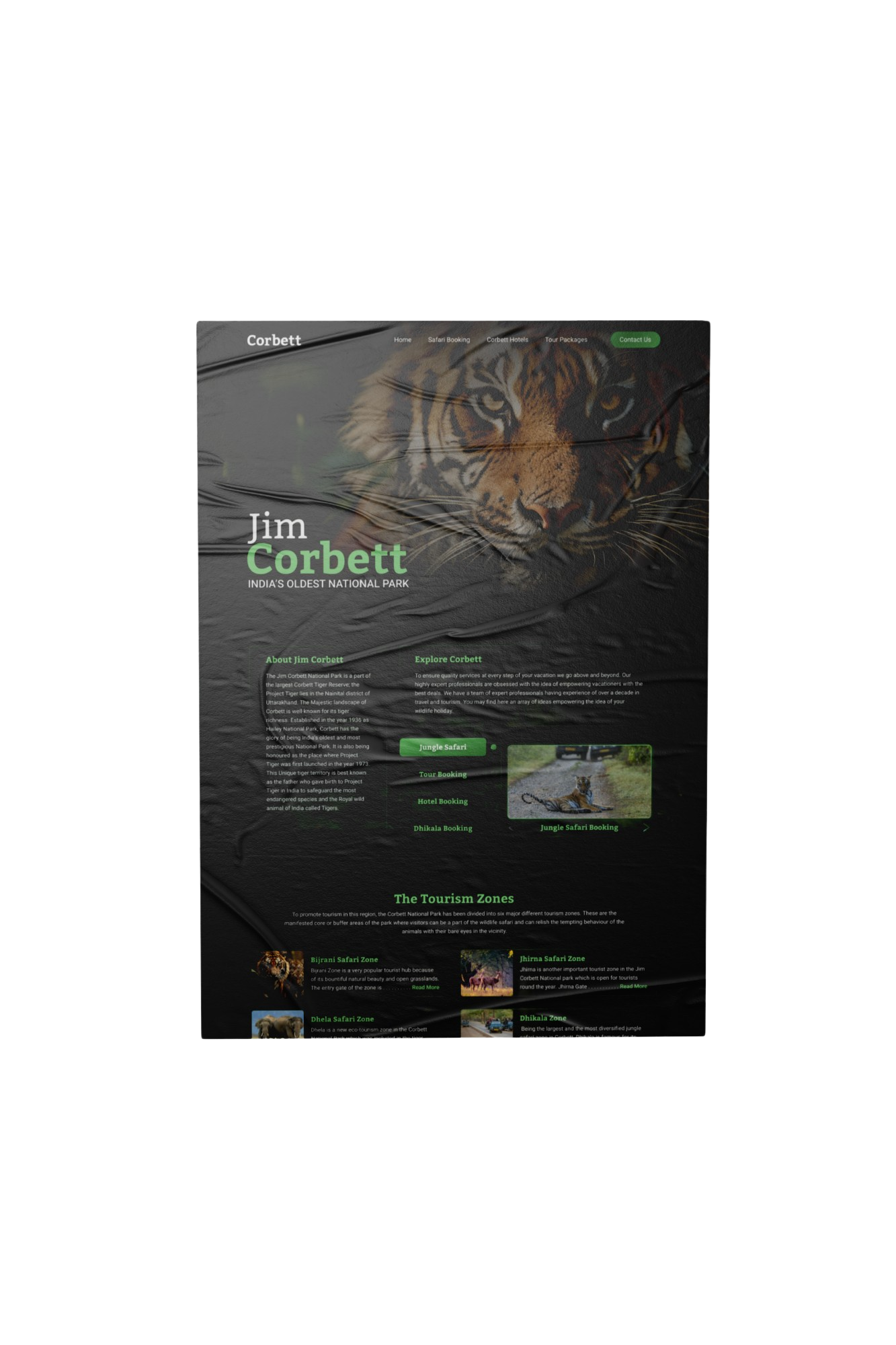 Jim Corbett National Park, nestled in the heart of India, stands as a sanctuary for wildlife enthusiasts and adventurers alike, renowned for its rich biodiversity and the elusive grace of its resident tigers. However, despite its natural splendor, the park’s online presence failed to captivate the imagination of potential visitors. The existing website, characterized by its plain and uninspiring design, lacked the dynamism and excitement befitting an adventure-filled destination like Corbett. Riddled with dense blocks of text and devoid of visual engagement, the website failed to convey the thrill of jungle safaris and other exhilarating activities offered within the park. Recognizing the untapped potential to ignite curiosity and foster a deeper connection with nature, I undertook the challenge of redesigning the homepage to breathe new life into the digital gateway of Jim Corbett National Park. With a fervent passion for tigers and a thirst for adventure, I set out to infuse the website with a sense of wonder, anticipation, and the untamed spirit of the jungle.